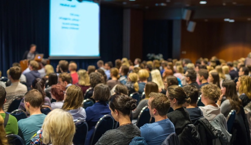 多机位录制项目方演讲(创始人/CMO/技术负责人),包含特写、全景、观众反应镜头